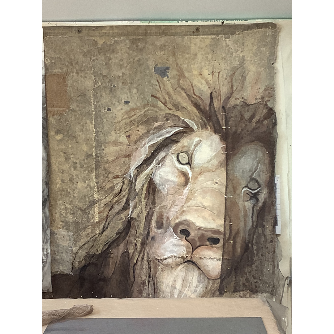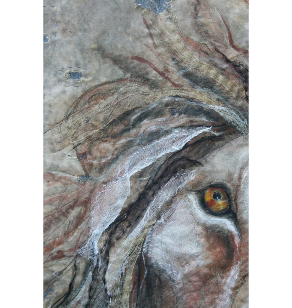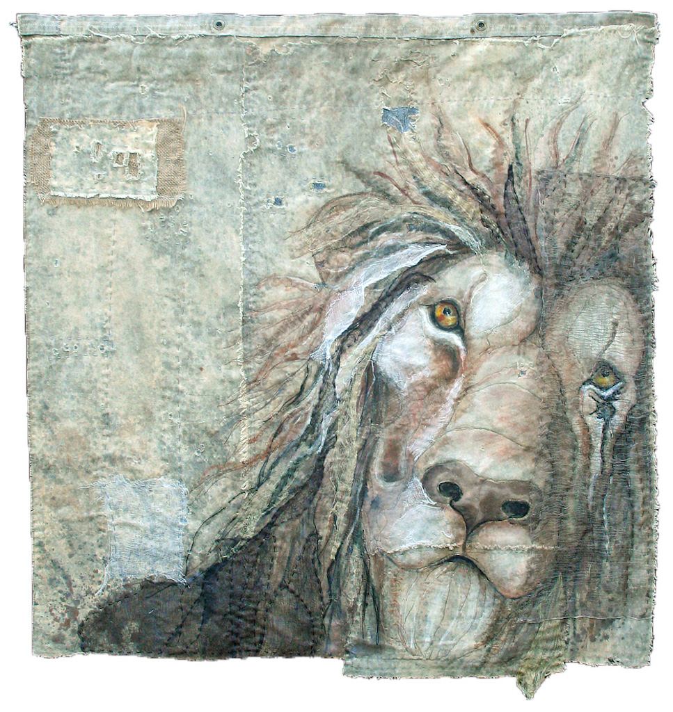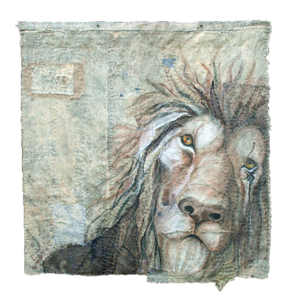 As I work out a portrait’s drawing I think a lot about how I want to layer the fabrics and how the quilting can add to the emotional impact of the image. A friend gave me a gloriously beat up, heavily stained, and damaged old tarp which felt like the perfect metaphor for this old lion. Hand quilting and embroidery felt like the best solution to the quilting since they denote a loving-hands-at-home quality and I wanted the viewers to really care about this lion.