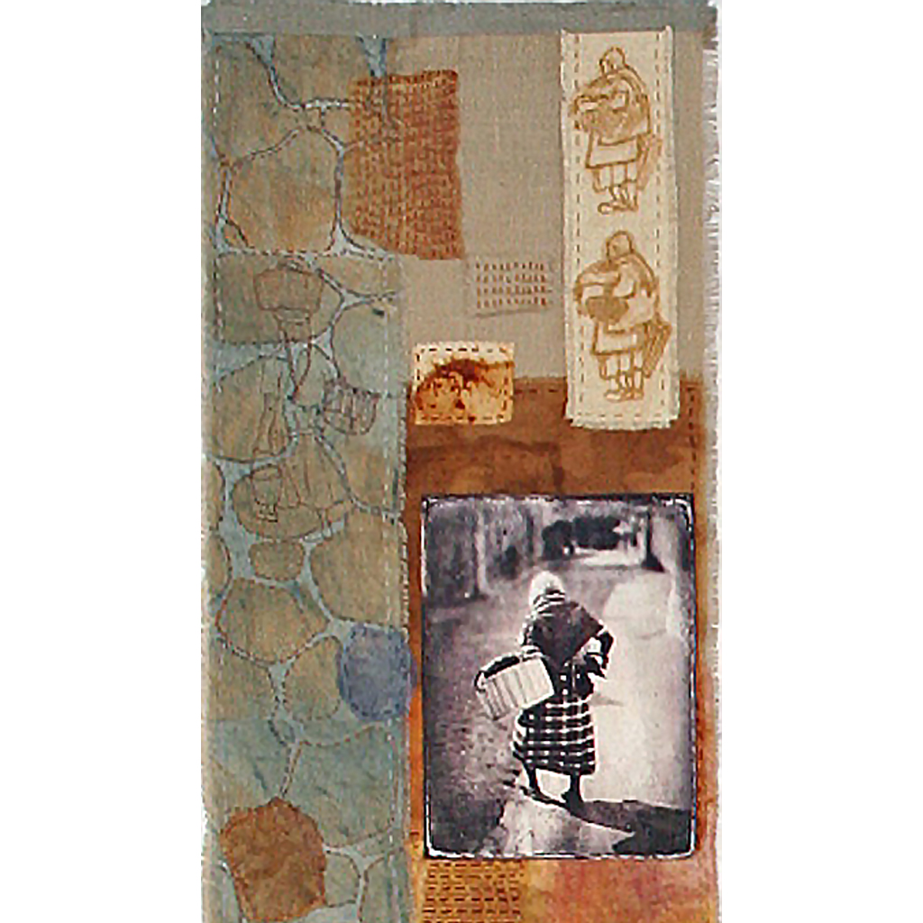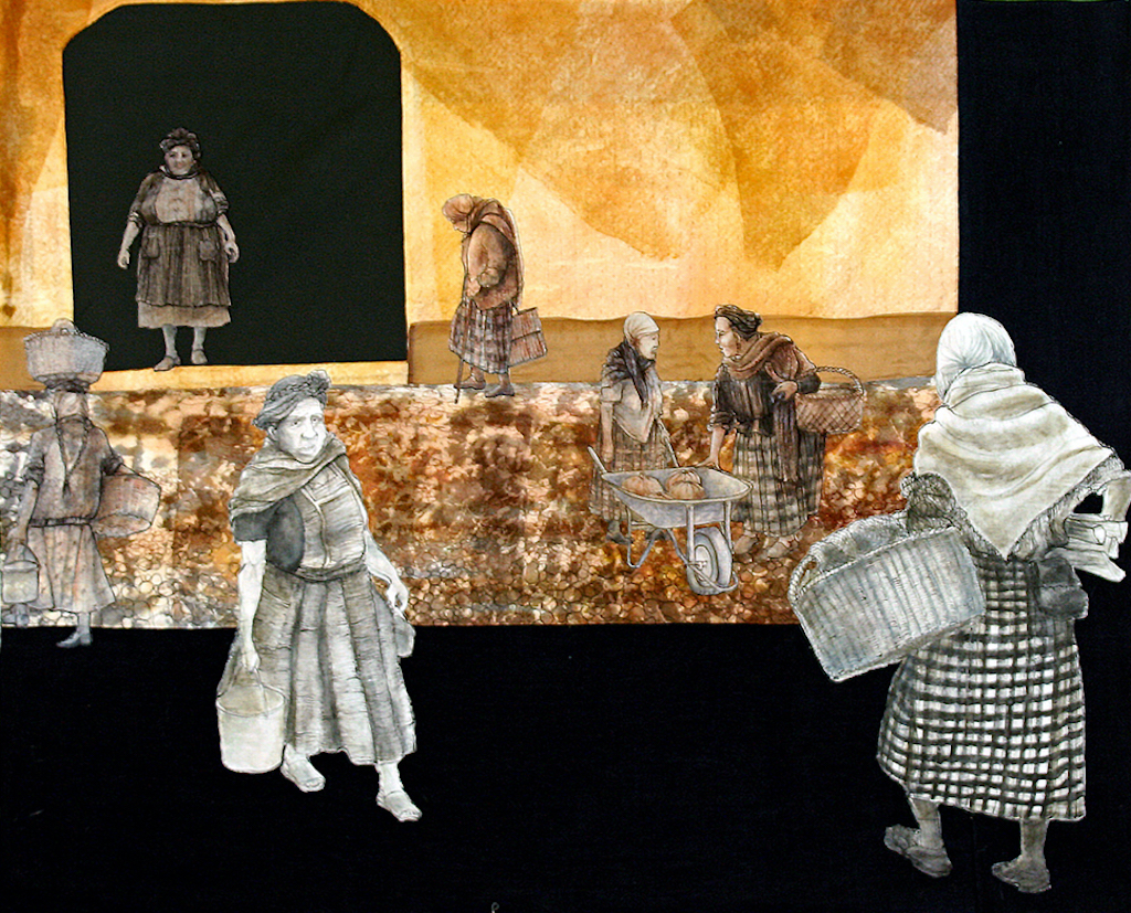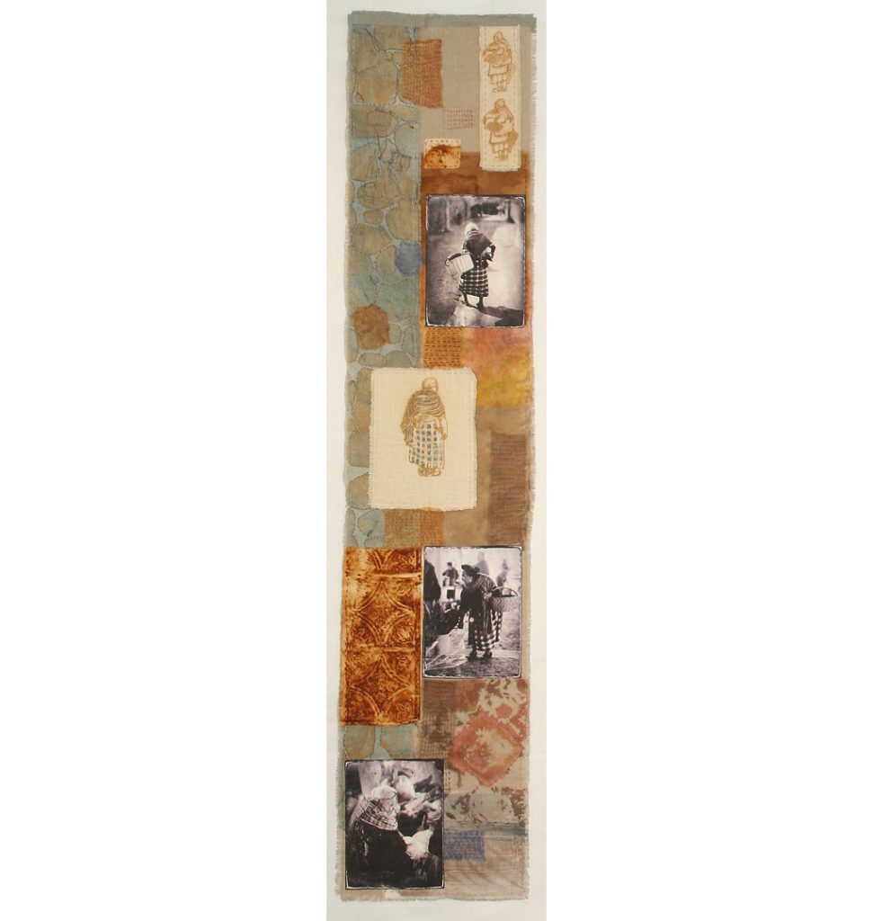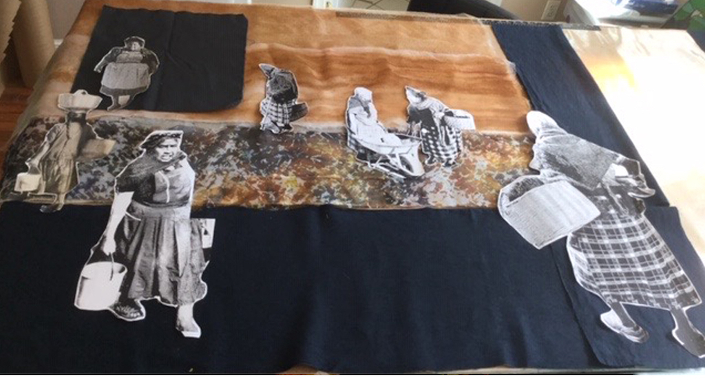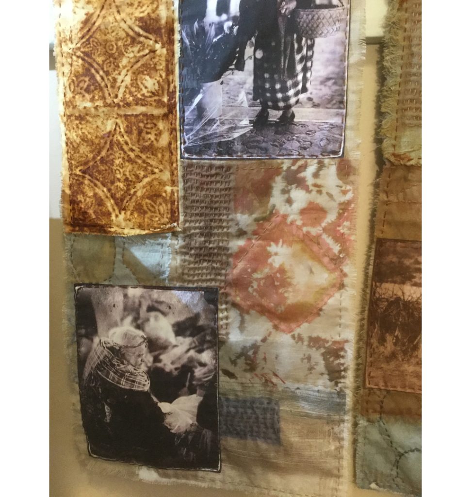 I worked with the imagery over several weeks, at first, by combining digitally printed photos and drawn pieces, with rust-dyed and silkscreened fabrics to capture the patterns of the stone and tile work in the town.