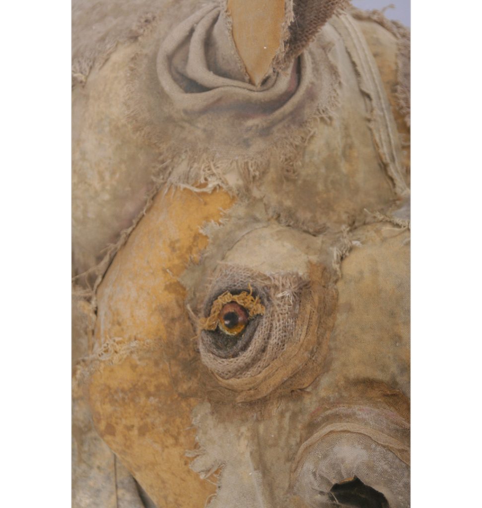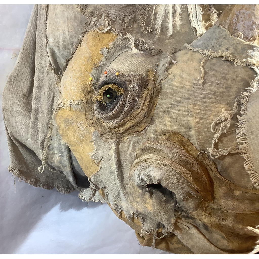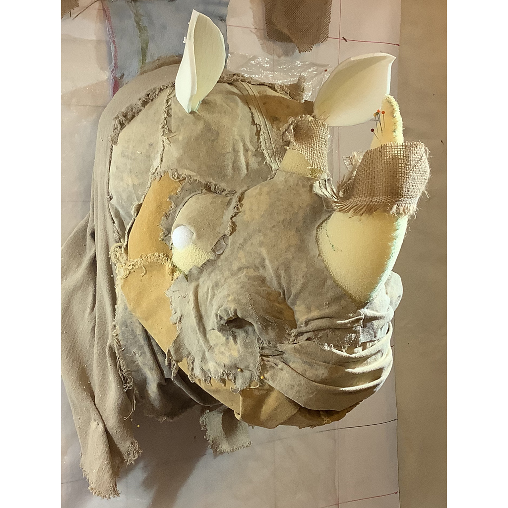 The Rhino and Elephant Veteran sculptures were developed in an approach I learned while working at the Muppets. I knew I wanted to cover them in the war surplus and damaged tarp fabrics I’d used in the rest of the Veteran series, but I needed a light weight and sturdy base underneath.