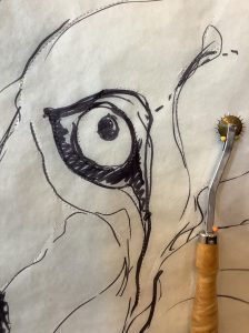 With a new layer of tracing paper, I traced over the key lines of the charcoal drawing and developed a pounce pattern to transfer the drawing to the tarp.