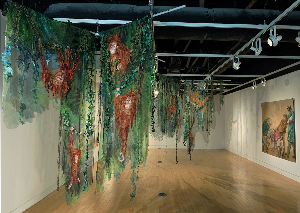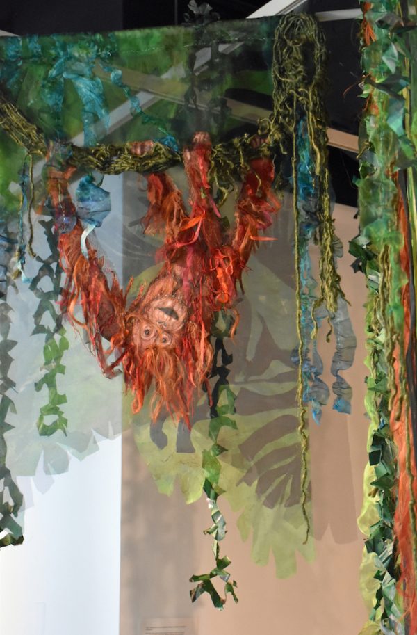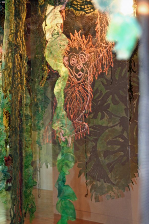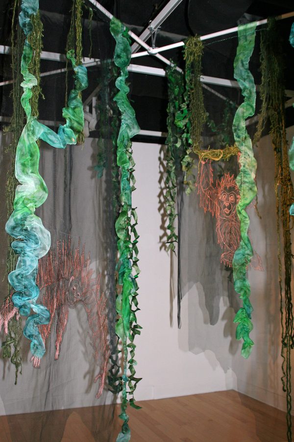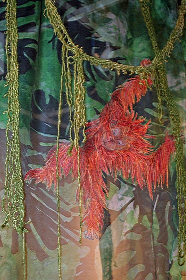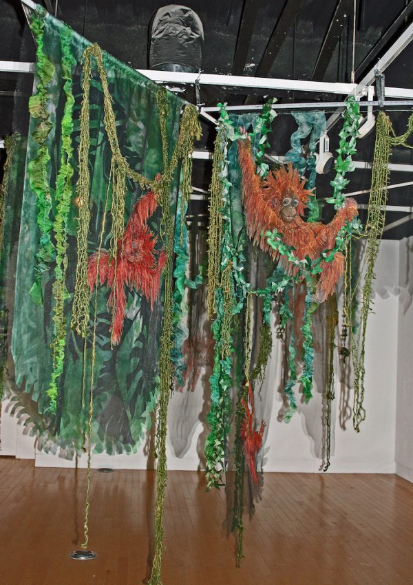 Artist’s statement: As orangutans lose their jungle habitat to the expansion of the palm oil industry both the jungle and the animals are disappearing. Orangutan babies are delightful, playful creatures and I find it hard to thinkof a world without them. This installation focuses on 3 phases of their disappearance: Phase 1 we see dimensional babies playing in a lush jungle; Phase 2 we see the jungle and the animals beginning to fade and the jungle starting to disappear; Phase 3 we see a ghostly remnant of the jungle and the animals. I used delicate, sheer layers to express the animals fragility.