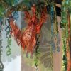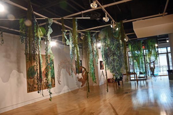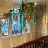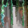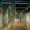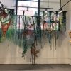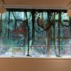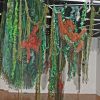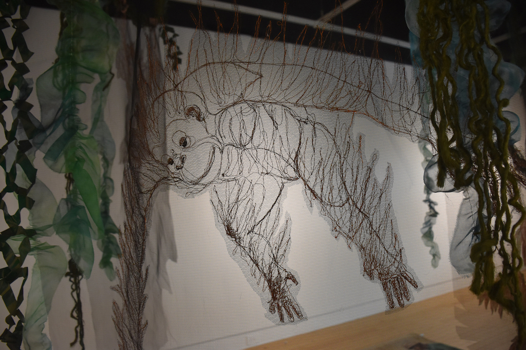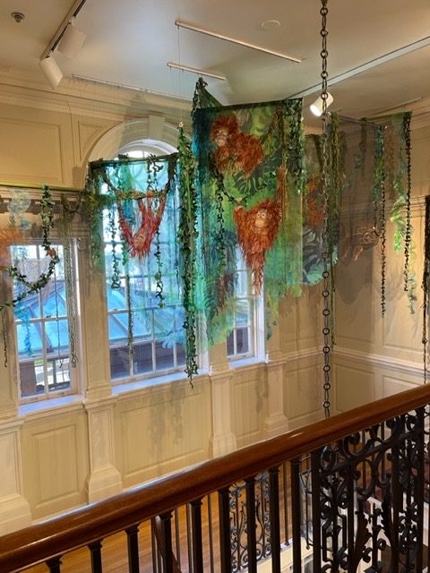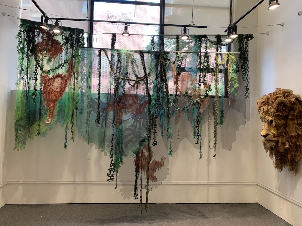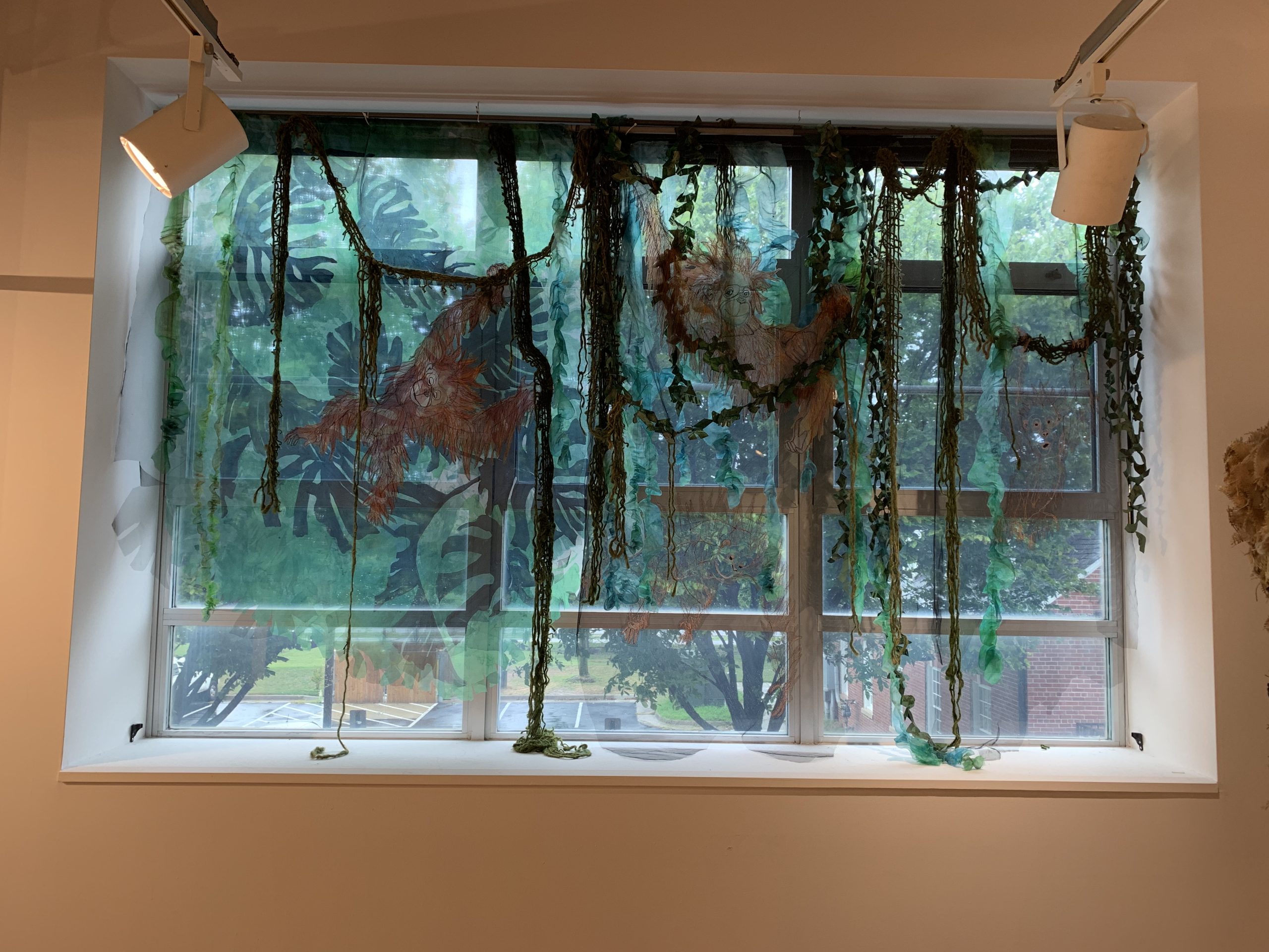 Artist’s statement: As orangutans lose their jungle habitat to the expansion of the palm oil industry both the jungle and the animals are disappearing. Orangutan babies are delightful, playful creatures and I find it hard to thinkof a world without them. This installation focuses on 3 phases of their disappearance: Phase 1 we see dimensional babies playing in a lush jungle; Phase 2 we see the jungle and the animals beginning to fade and the jungle starting to disappear; Phase 3 we see a ghostly remnant of the jungle and the animals. I used delicate, sheer layers to express the animals fragility.