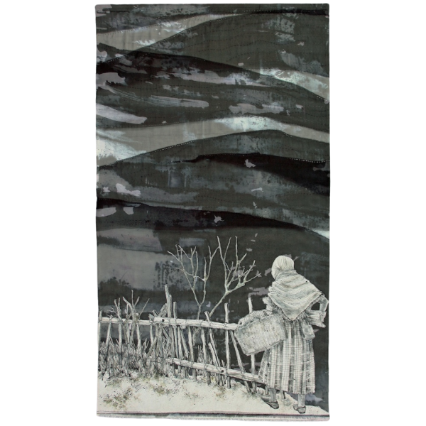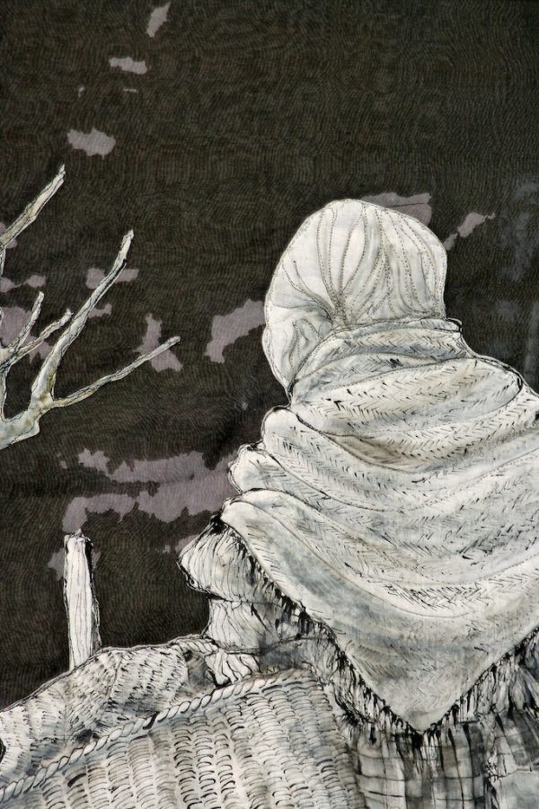 Techniques: layered dyed fabric collage, hand drawing and painting, free motion and hand quilting.