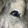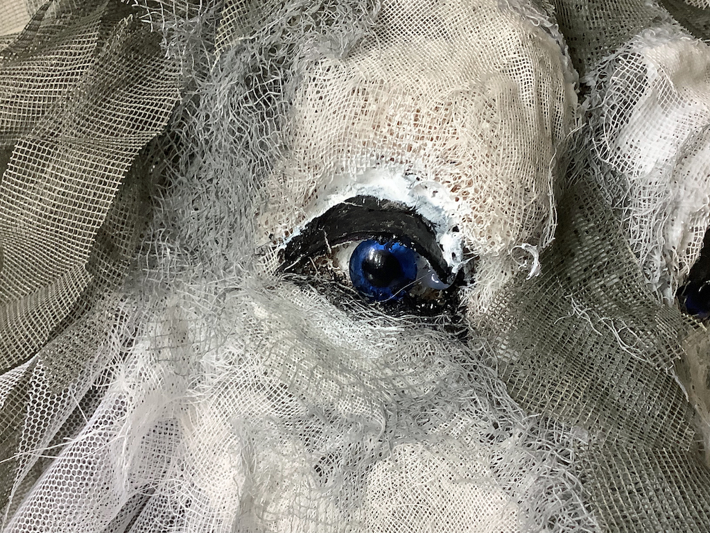 Materials: up-cycled army mosquito netting, garden netting, cheesecloth, fabric paint, reticulated foam, resin eyes