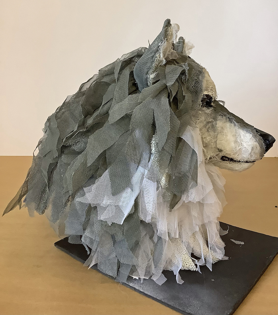 Artist’s Statement: Vanishing species are veterans in the war against encroachment on their territories, hunting for their body parts, and the battle against changing climates. This inspired me to use up cycled war surplus netting and cheesecloth to express both the toughness of their battle and their fragility.